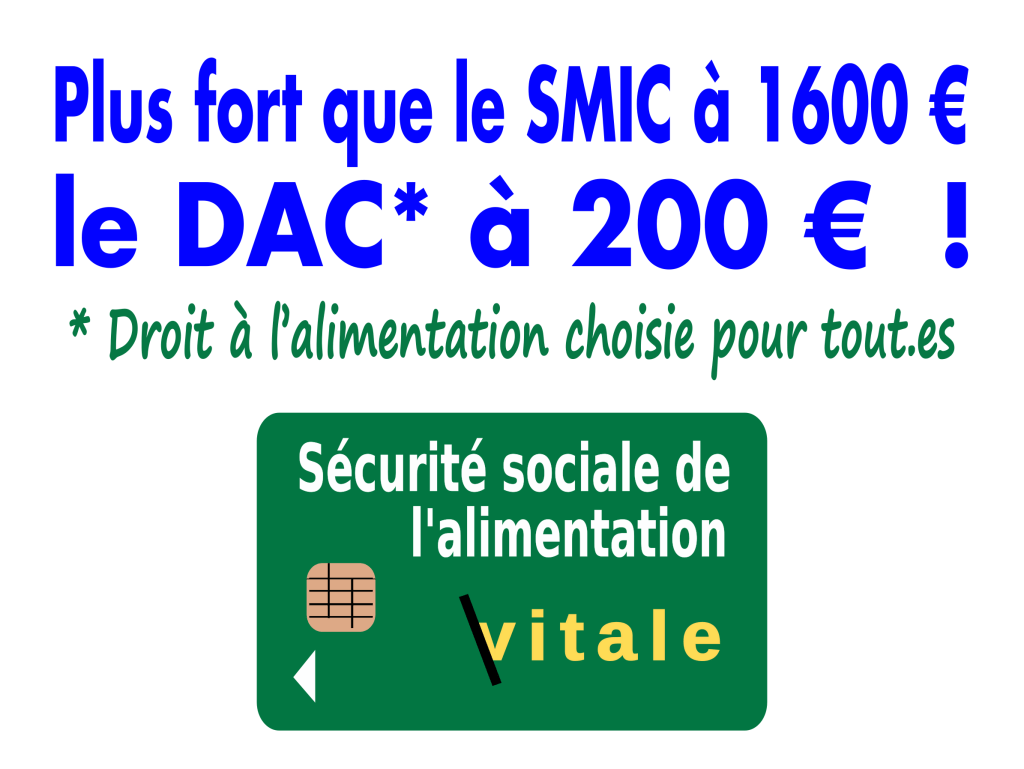 Ce Droit à l’Alimentation Choisie ou DAC, garantirait à chaque personne vivant en France un accès équivalent à 200 euros par mois en alimentation choisie conventionnée. C’est l’équivalent de l’augmentation du SMIC prévue, passant de presque 1400 euros nets mensuels pour 35 heures actuellement à 1600 euros nets.