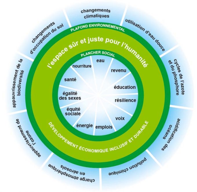 Face aux urgences sociales et écologiques, pour que les choix nécessaires puissent être faits tout en améliorant les conditions de vie de chacun.e, nous avons besoin de contenir l’activité humaine globale sous un « plafond écologique » respectant les limites planétaires, tout en garantissant un « plancher social » assurant à toutes et tous des conditions de vie satisfaisantes et stables. Cela définit l’espace écologique décrit dans la « théorie du Donut » par l’économiste Kate Raworth www.oxfamfrance.org/actualite/la-theorie-du-donut-une-nouvelle-economie-est-possible